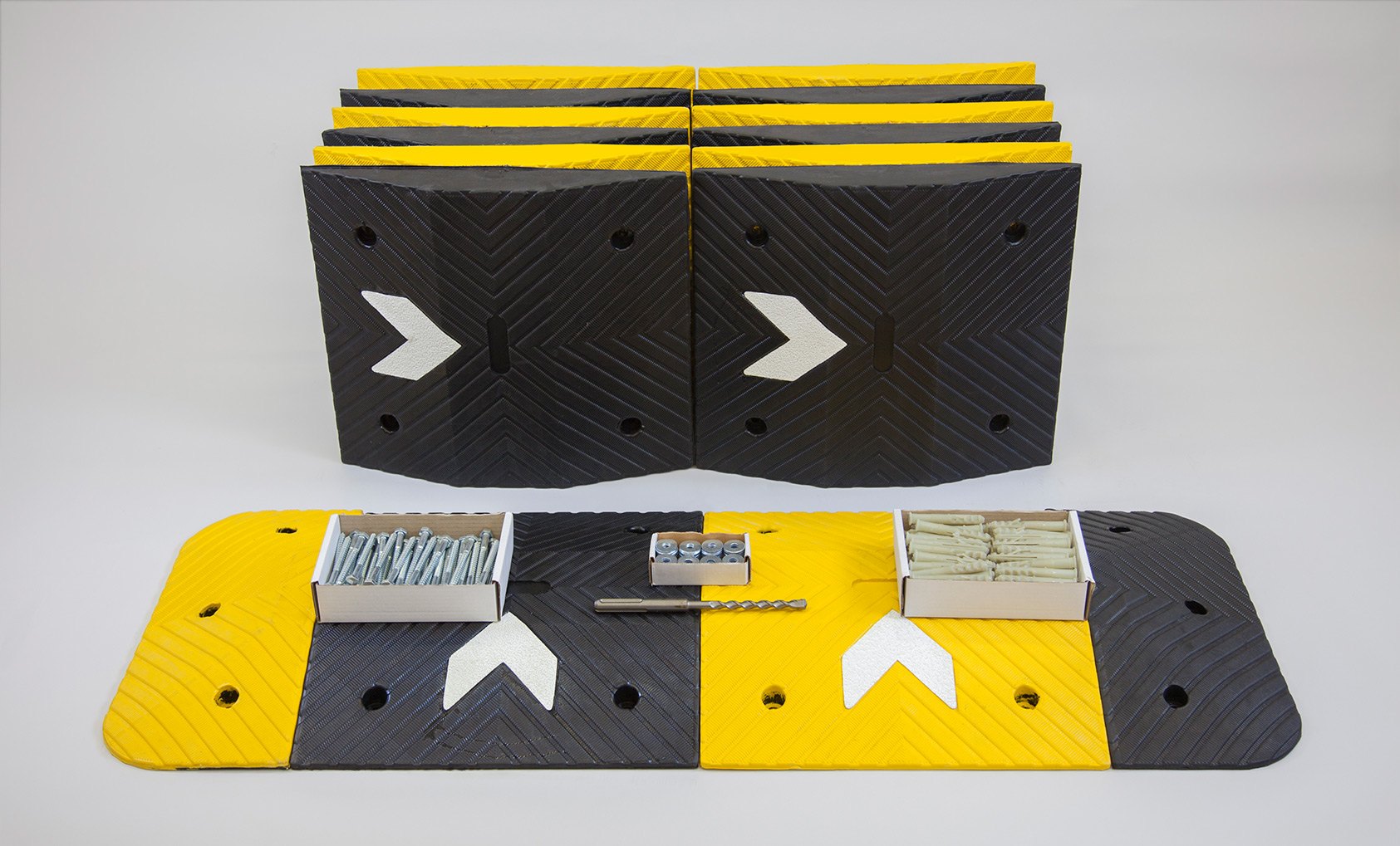 - With a light reflective chevron on each middle section showing direction flow these speed bumps are highly visible at night