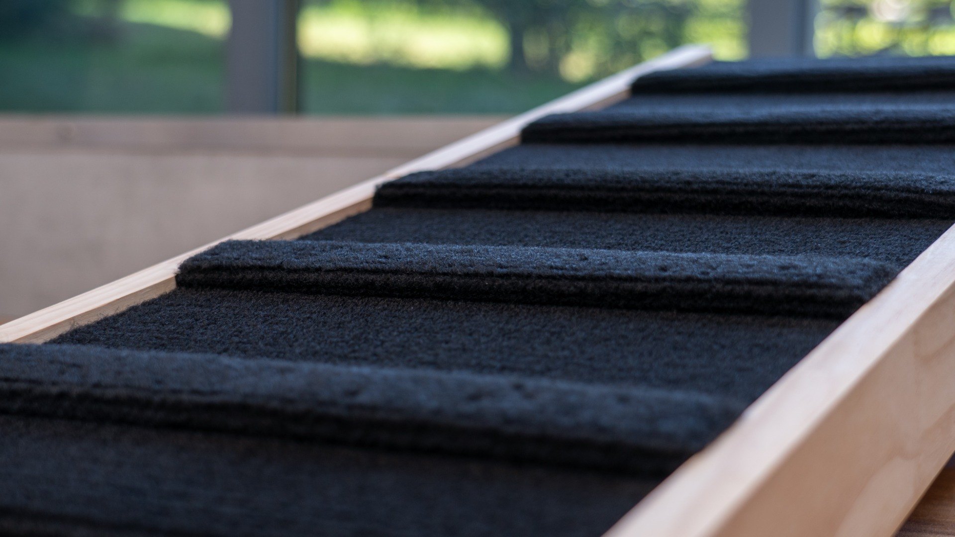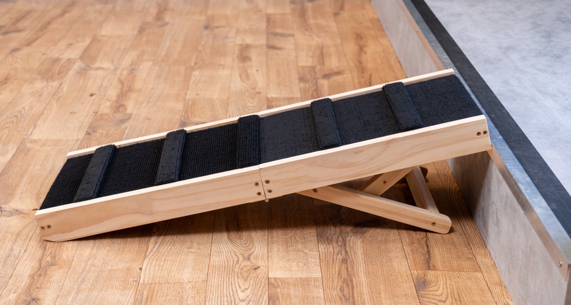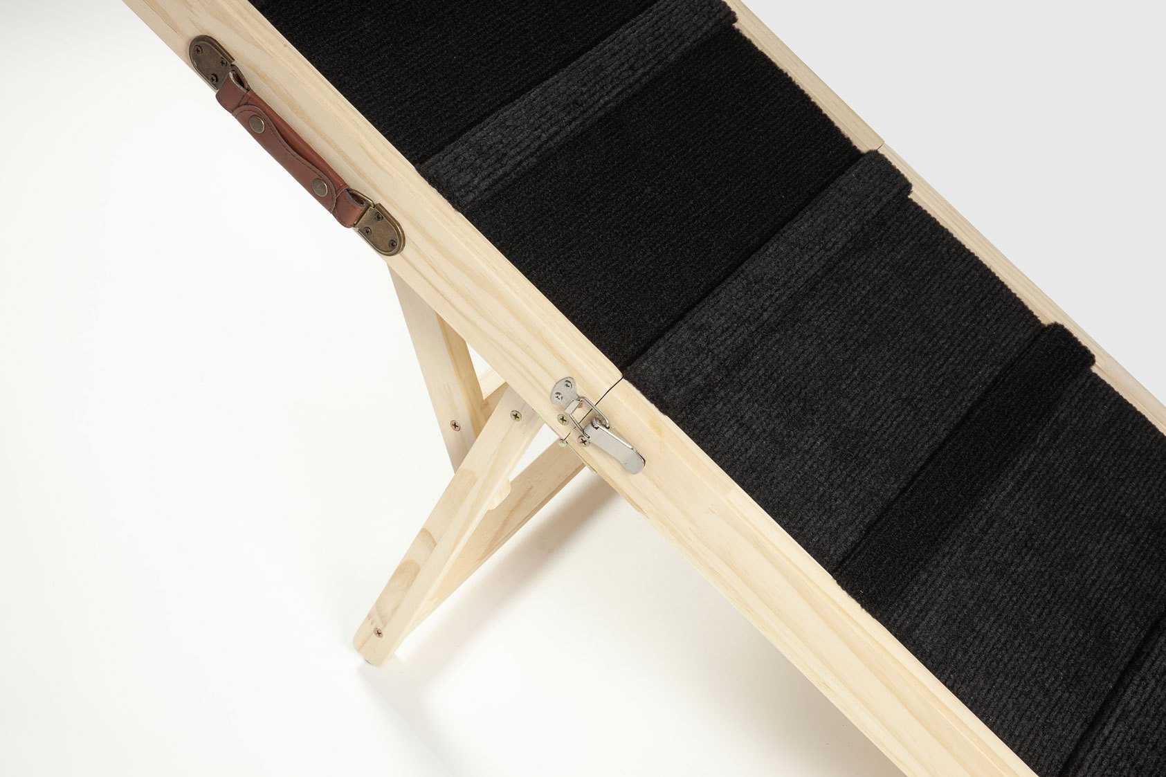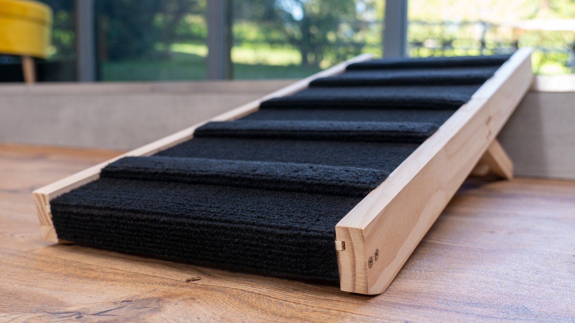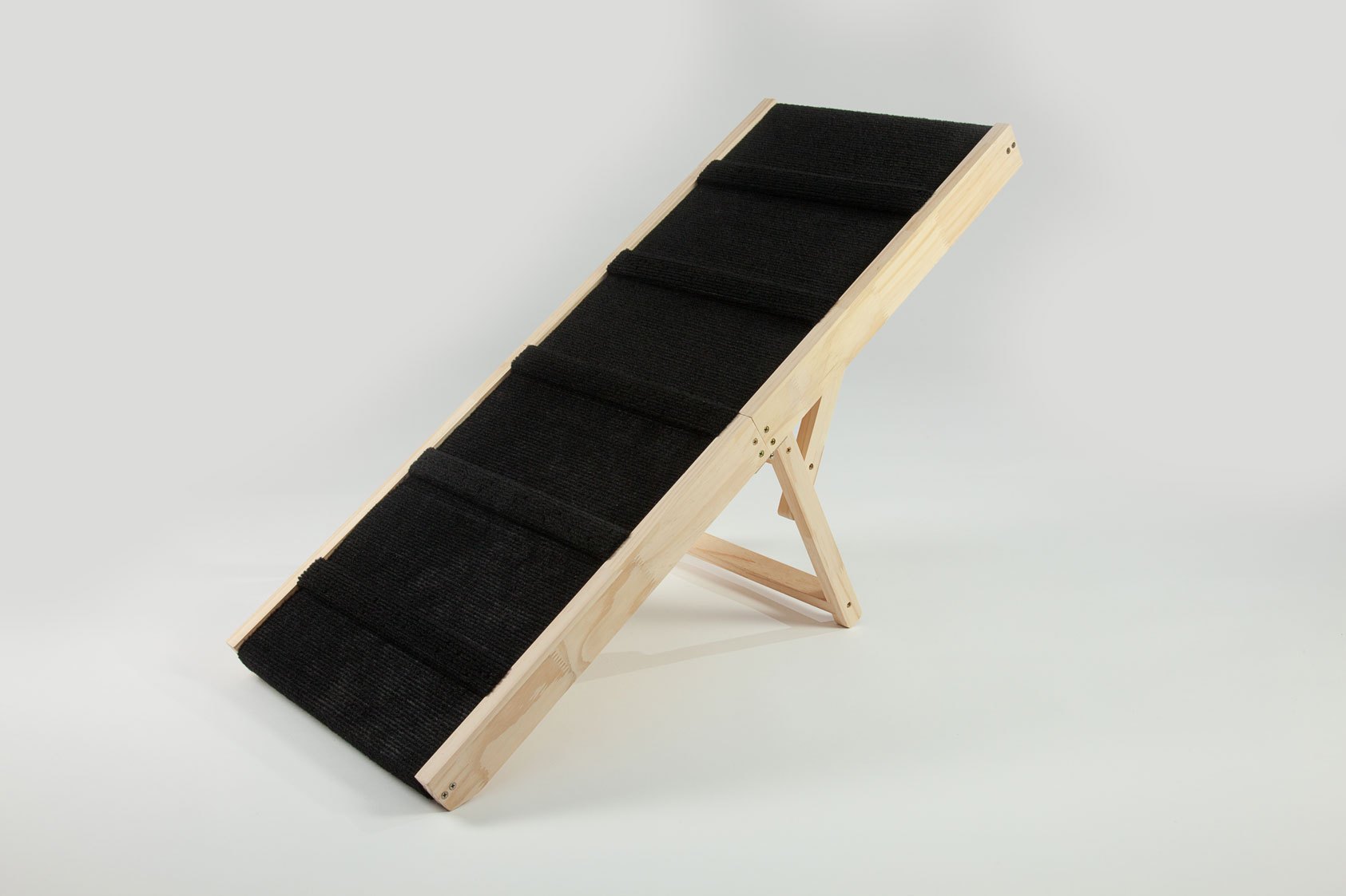 - Wooden ramp with a carpeted ladder design, dog-friendly non-slip surface