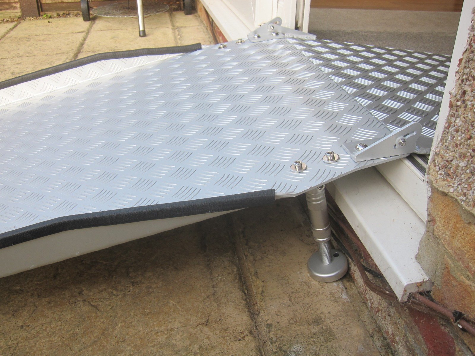 Fixed Aluminium Threshold Ramp with adjustable legs designed to overcome steps and thresholds between 70mm - 254mm (3" - 10"). The wheelchair ramp is provided with an entry plate to allow users to simply flip the plate over the doorway to seamlessly overcome door thresholds, including difficult uPVC doorways. The ramp is available in 2ft to 8ft and can be fixed in place where preferred.