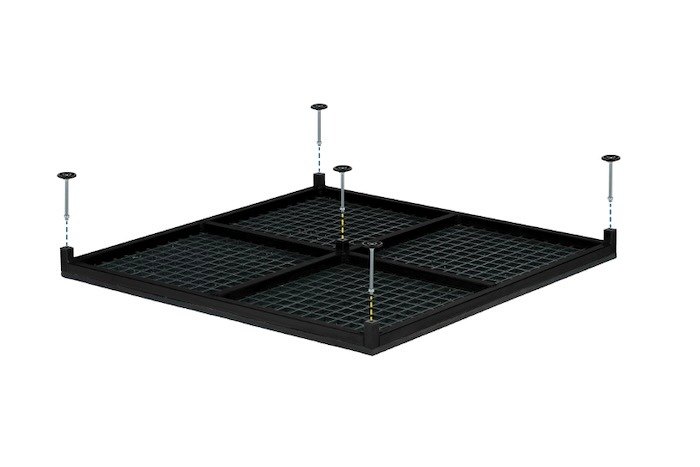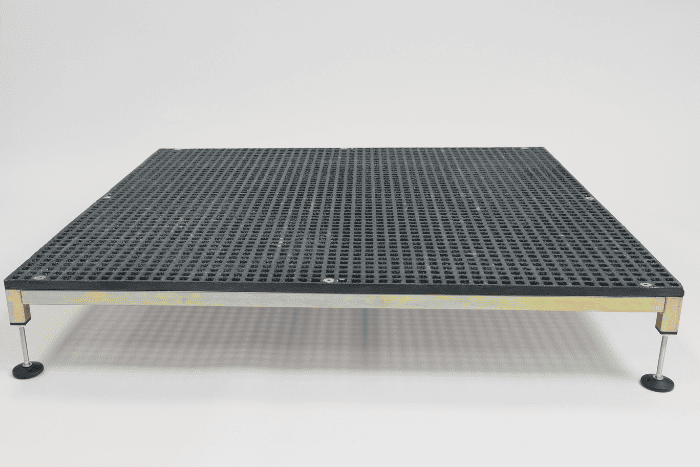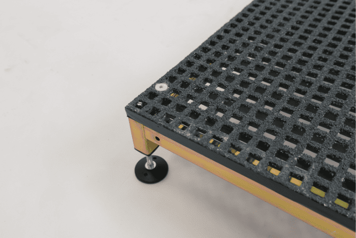 - Adjustable in height.The platform can be used without legs to achieve a height of 80mm. For the 120mm option, the self-levelling legs can be adjusted between 105mm and 120mm. The 185mm option includes an additional set of support legs, designed for flat ground, with pre-drilled fixing points to secure the ground where preferred. The higher legs are adjustable between 125mm and 185 mm.