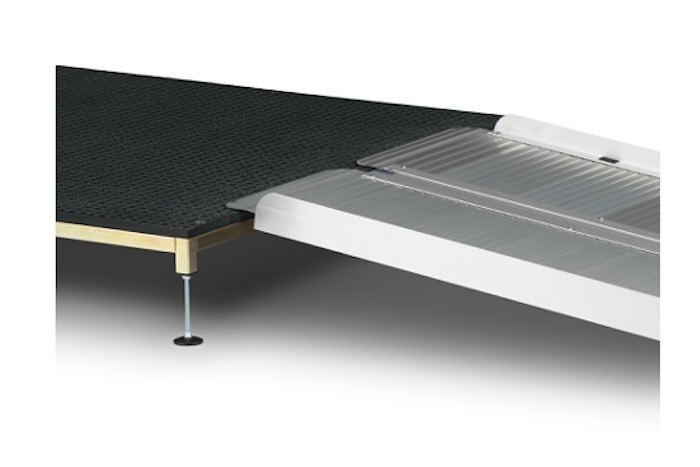 The platform can be used in conjunction with a range of access ramps. Fixings are provided to allow the rest on connection of The Ramp People's Folding Wheelchair Ramps or Portable Wheelchair Ramps to be secured to the platform during use.