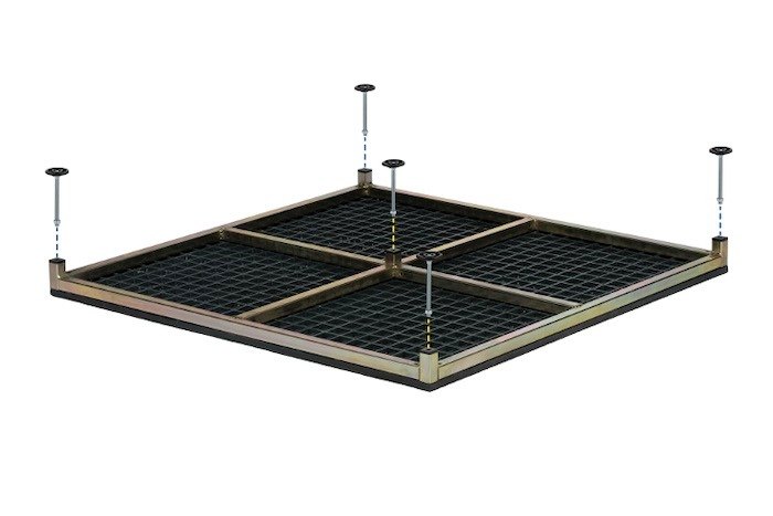 The platform can be used without legs to achieve a height of 80mm. For the 120mm option, the self-levelling legs can be adjusted between 105mm and 120mm. The 185mm option includes an additional set of support legs, designed for flat ground, with pre-drilled fixing points to secure the ground. The higher legs are adjustable between 125mm and 185mm.