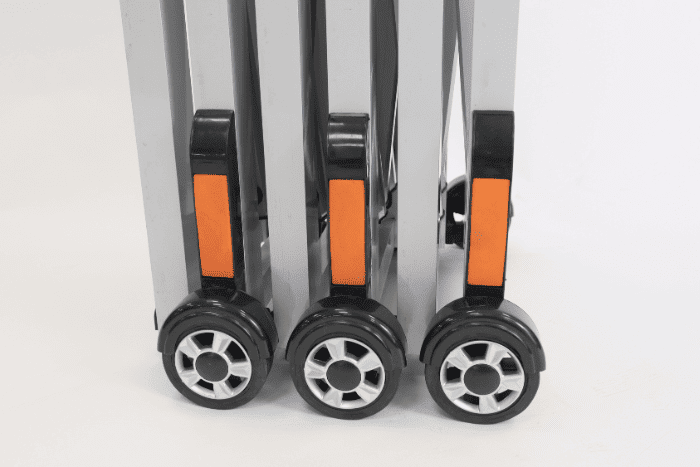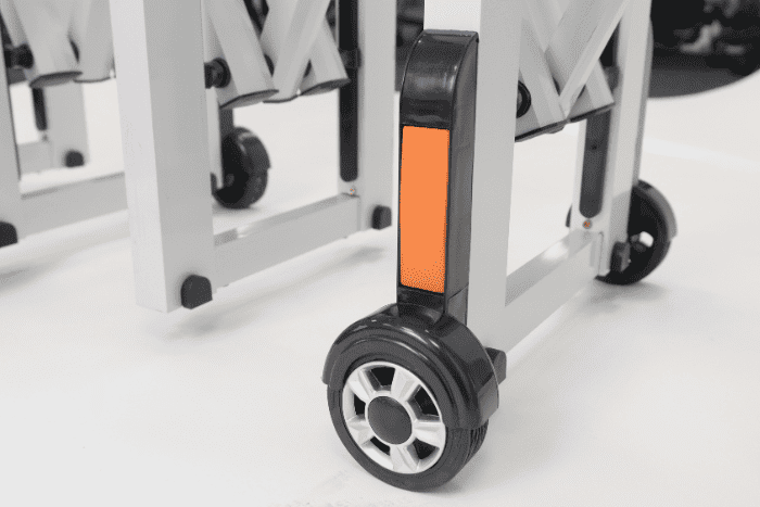 Provided on wheels, the barrier can be quickly extended by one person to cover various lengths up to 2m.
