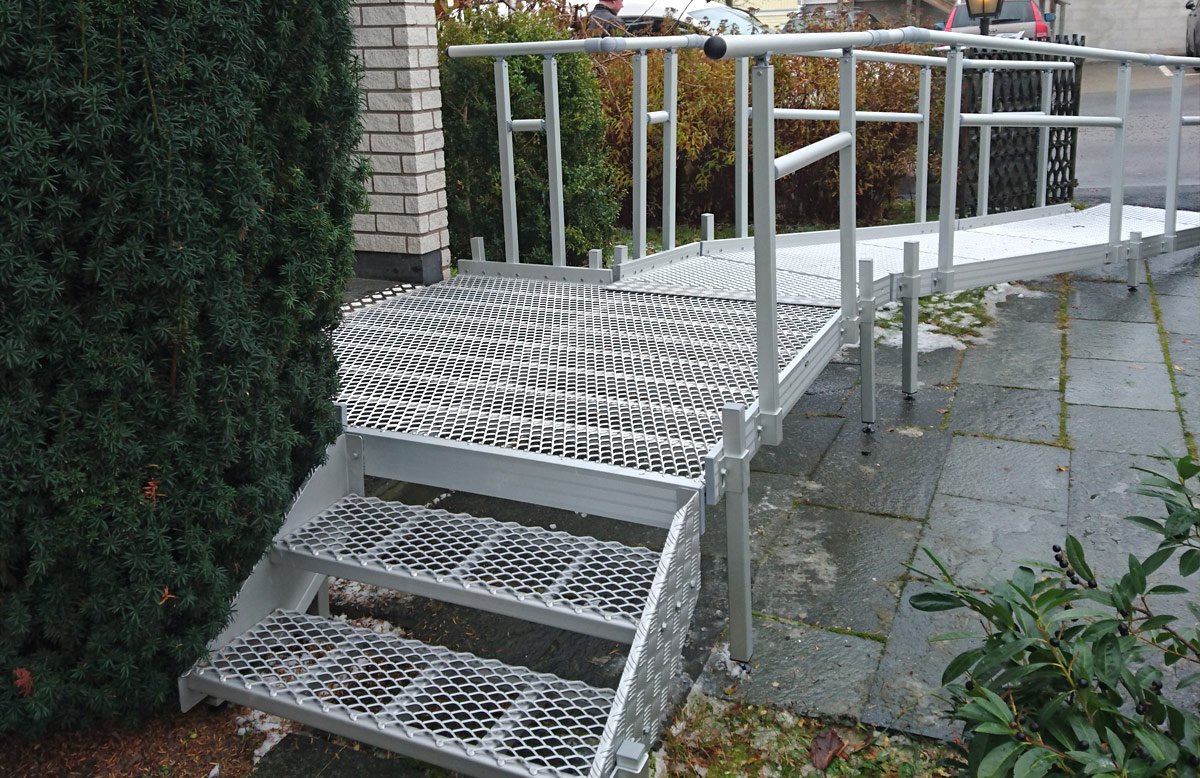 Modular Ramp Kit, 1250mm long, 900mm wide, with double height handrails and mesh anti-slip surface.