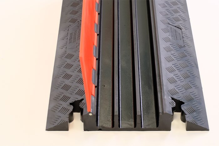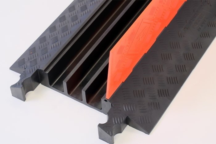 Guard Dog 3-Channel Cable Protector with hinged lid provides a safe crossing for vehicle and pedestrian traffic while protecting valuable electrical cables and hose lines from damage. Modular interlocking design is ideal for use in amusement parks, entertainment venues, sporting events, and most public, commercial, industrial, construction, and utility applications.