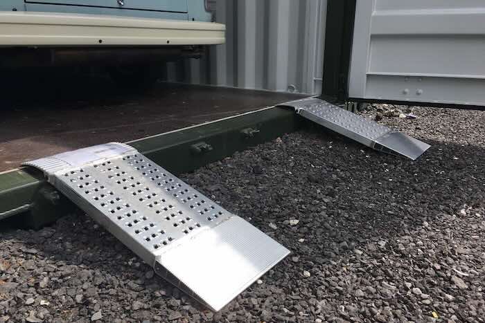 Pair of lightweight aluminium container ramps. These ramps can be used to load cars and light to medium equipment into or out of containers, over kerbs and other low obstacles.
