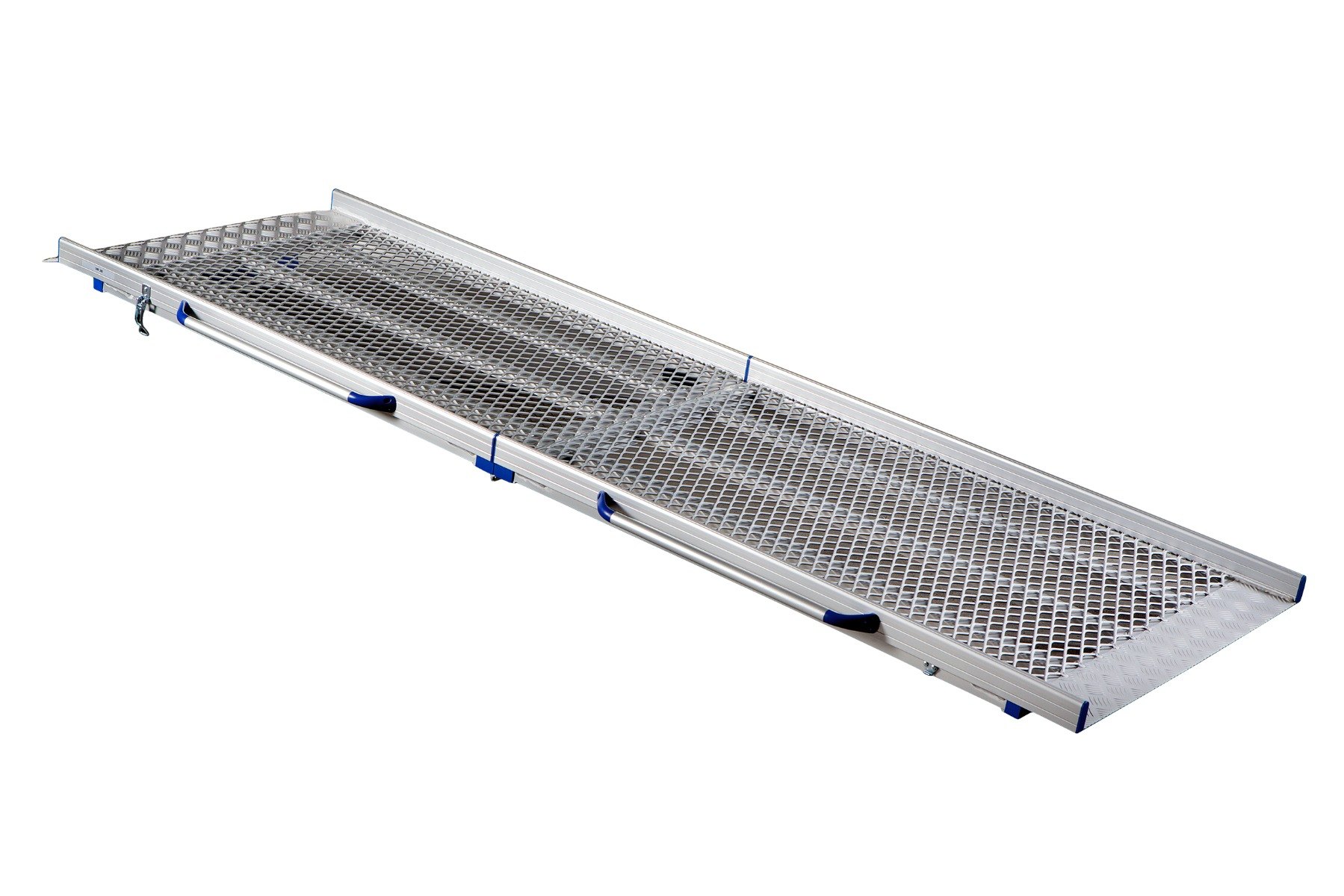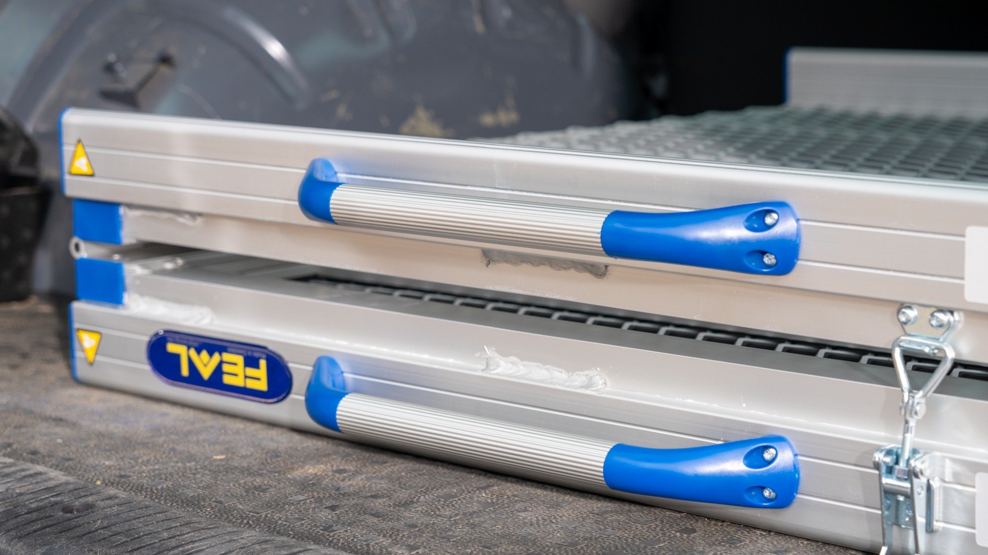 - Portable loading ramp with blue carry handles built onto the side of the ramp
