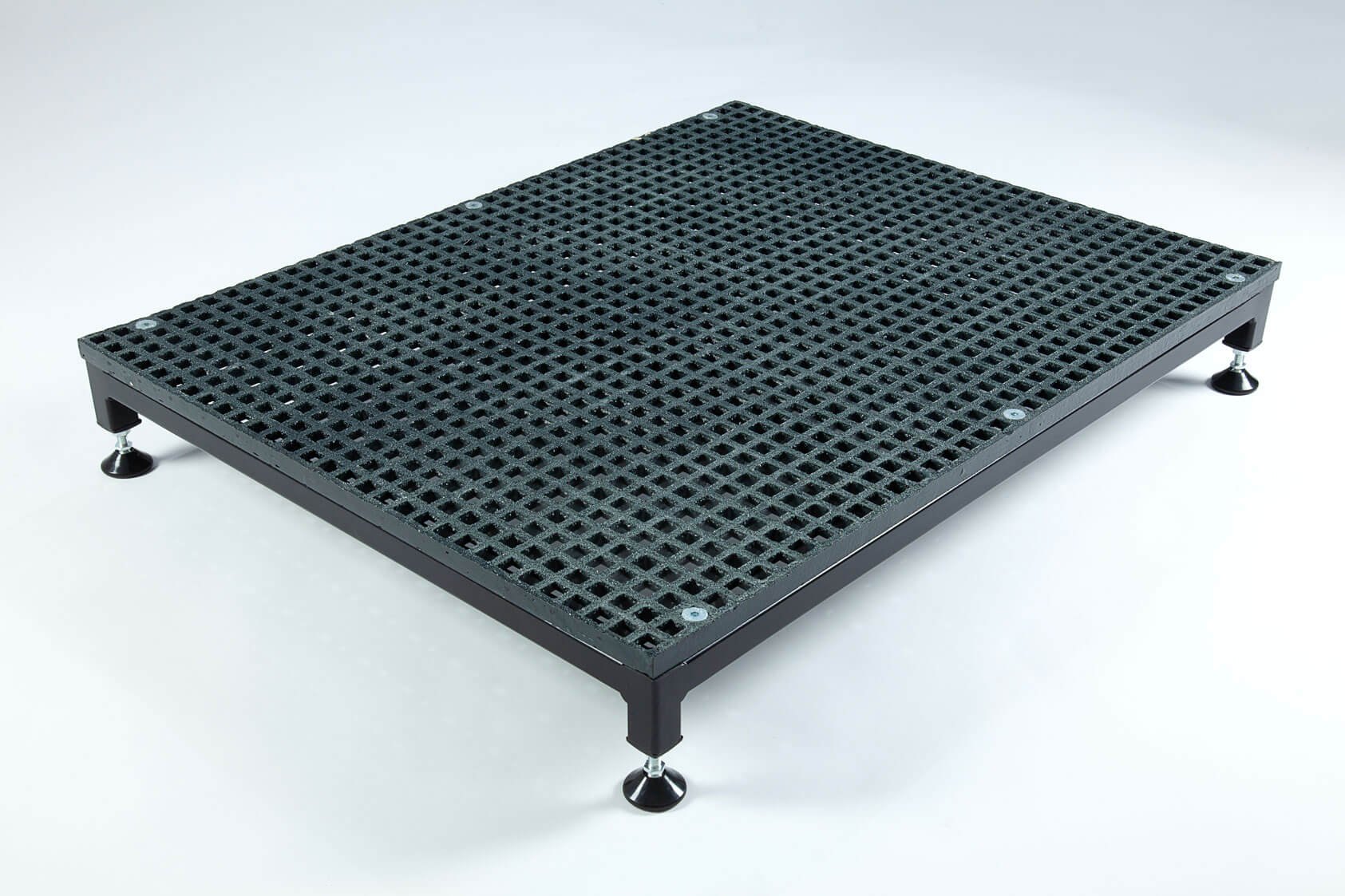 The adjustable step can be used without legs to achieve a height of 80mm. For the 120mm option, the self-levelling legs can be adjusted between 105mm and 120mm. The 185mm option includes an additional set of support legs, designed for flat ground, with pre-drilled fixing points to secure the ground where preferred. The higher legs are adjustable between 125mm and 185mm.