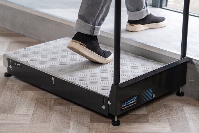 The adjustable half-step is available in three sizes and can be purchased with or without a handrail. The half step is adjustable to heights between 80mm - 150mm and can be secured in place. Half steps can be used as a mobility aid to assist those with disabilities, such as those with limited mobility, to overcome heights.