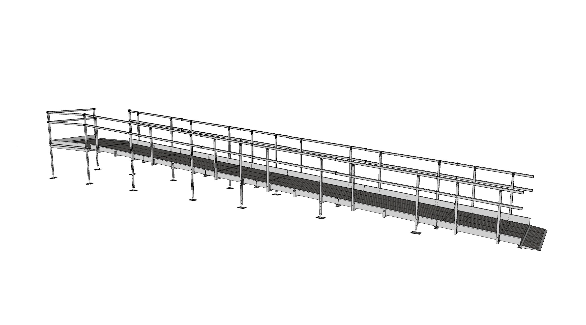 Modular Wheelchair Ramp System. Provided in the length of 10400mm plus 300mm lead in ramp, 1500mm wide, internal width 1276mm, with double height handrails, platform and mesh anti-slip surface.