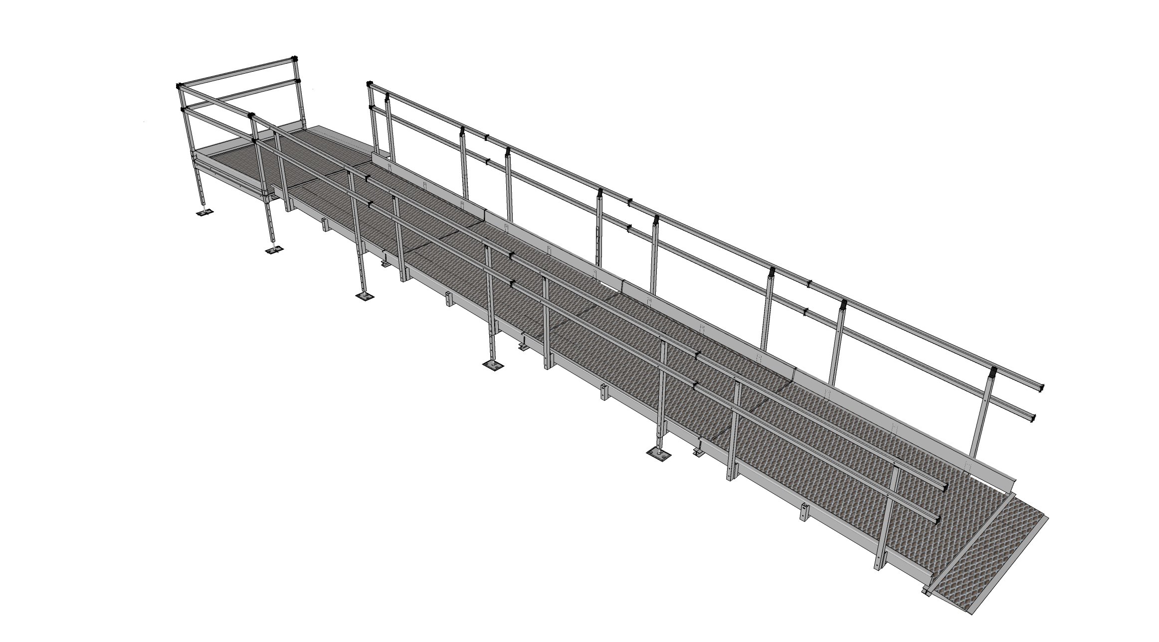 Modular Ramp Kit, 7600mm long, 1500mm wide, with double height handrails and mesh anti-slip surface.