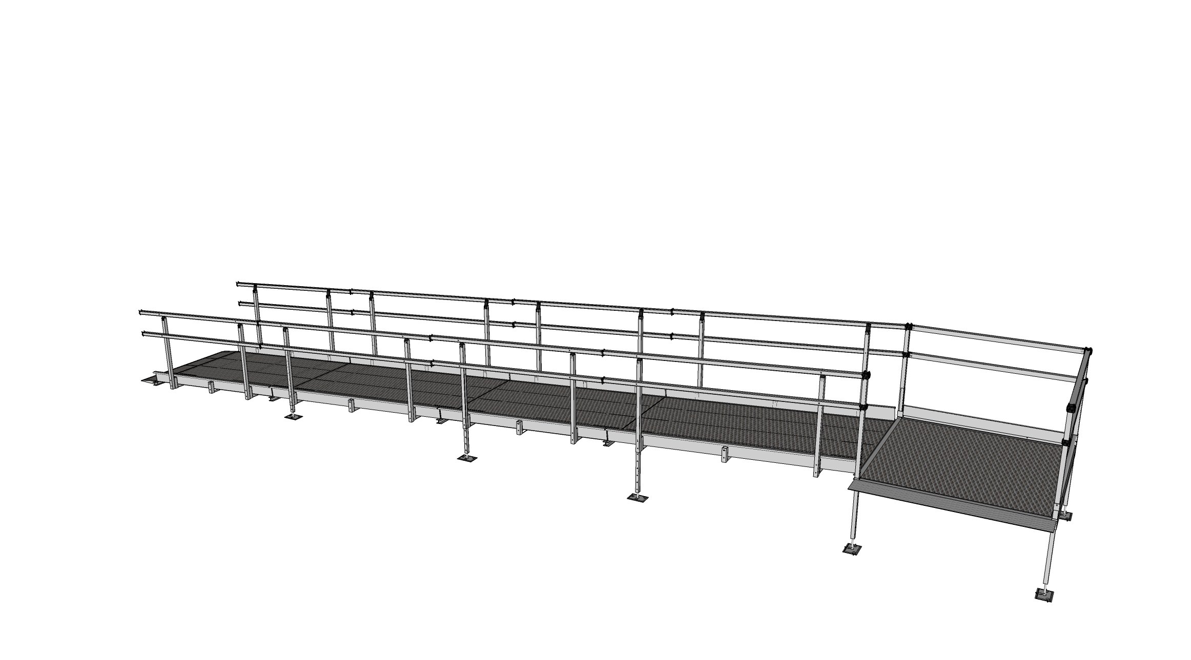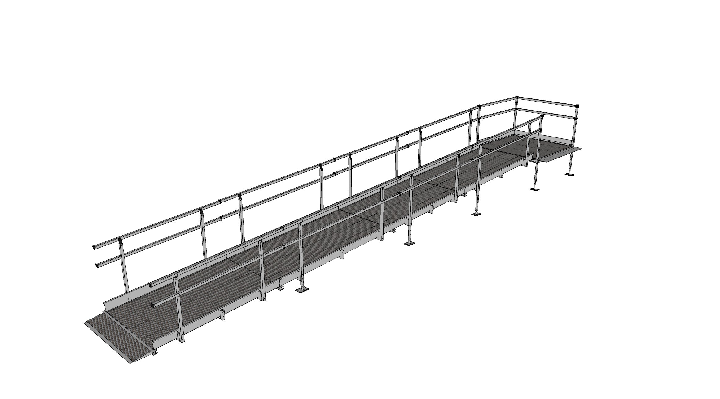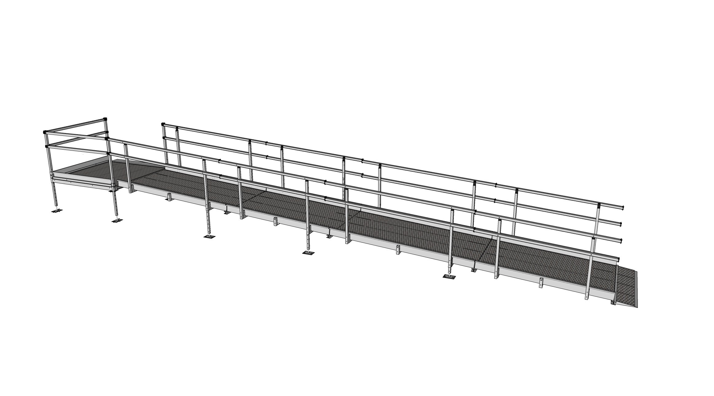 Modular Ramp System, 8400mm long plus 300mm lead in ramp, 1500mm wide, internal width 1276mm, with double height handrails, platform and mesh anti-slip surface.