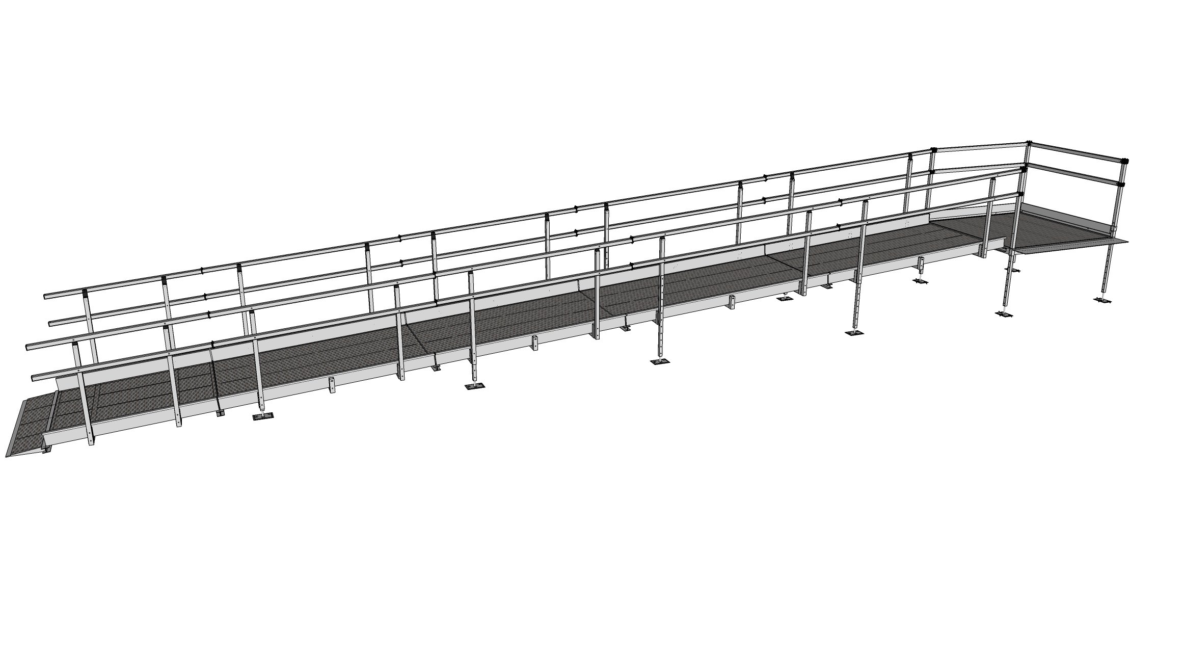 Modular Ramp System, 9800mm long plus 300mm lead in ramp, 1500mm wide, internal width 1276mm, with double height handrails, platform and mesh anti-slip surface.