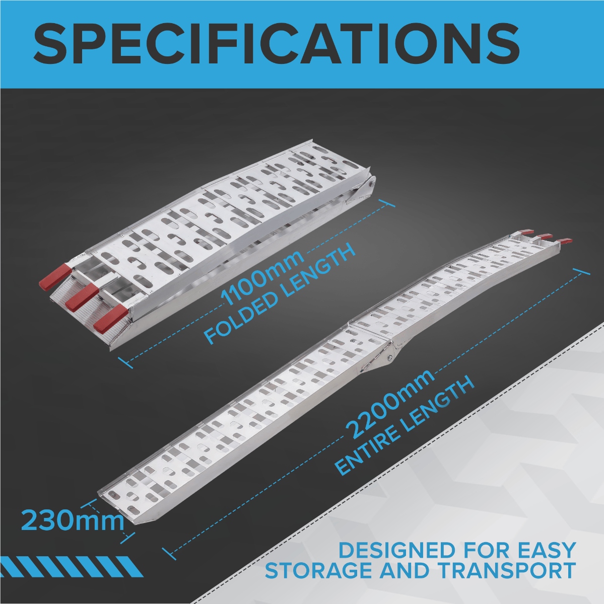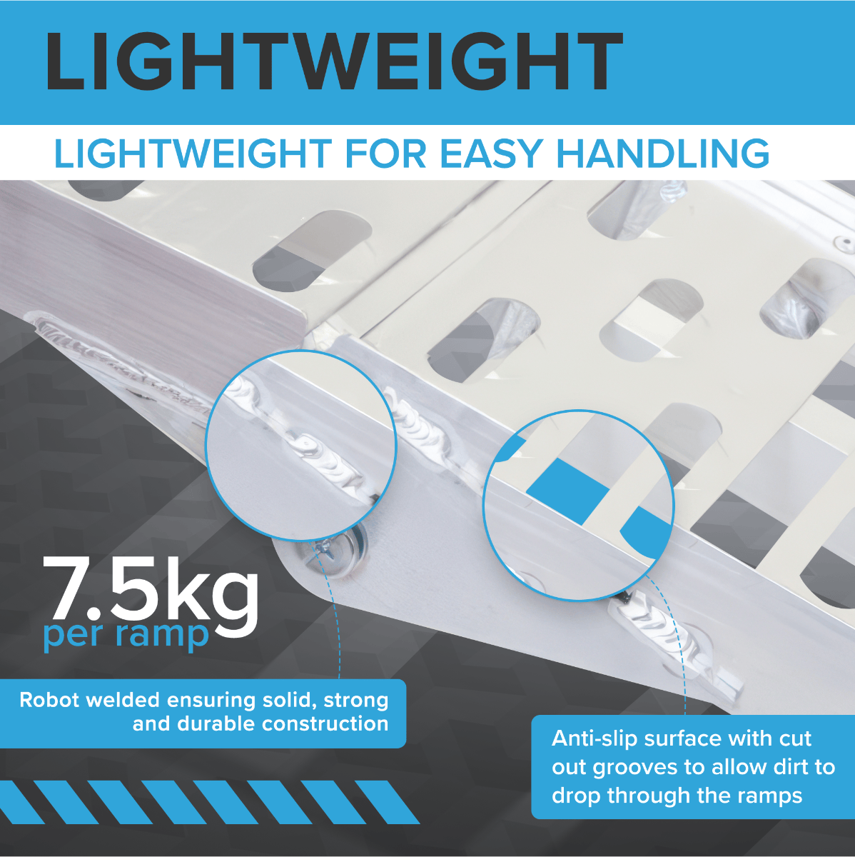 With a 300kg capacity per ramp (600kg across the pair), these aluminium ramps are ideal for loading motorcycles, quad bikes, and other similar vehicles.