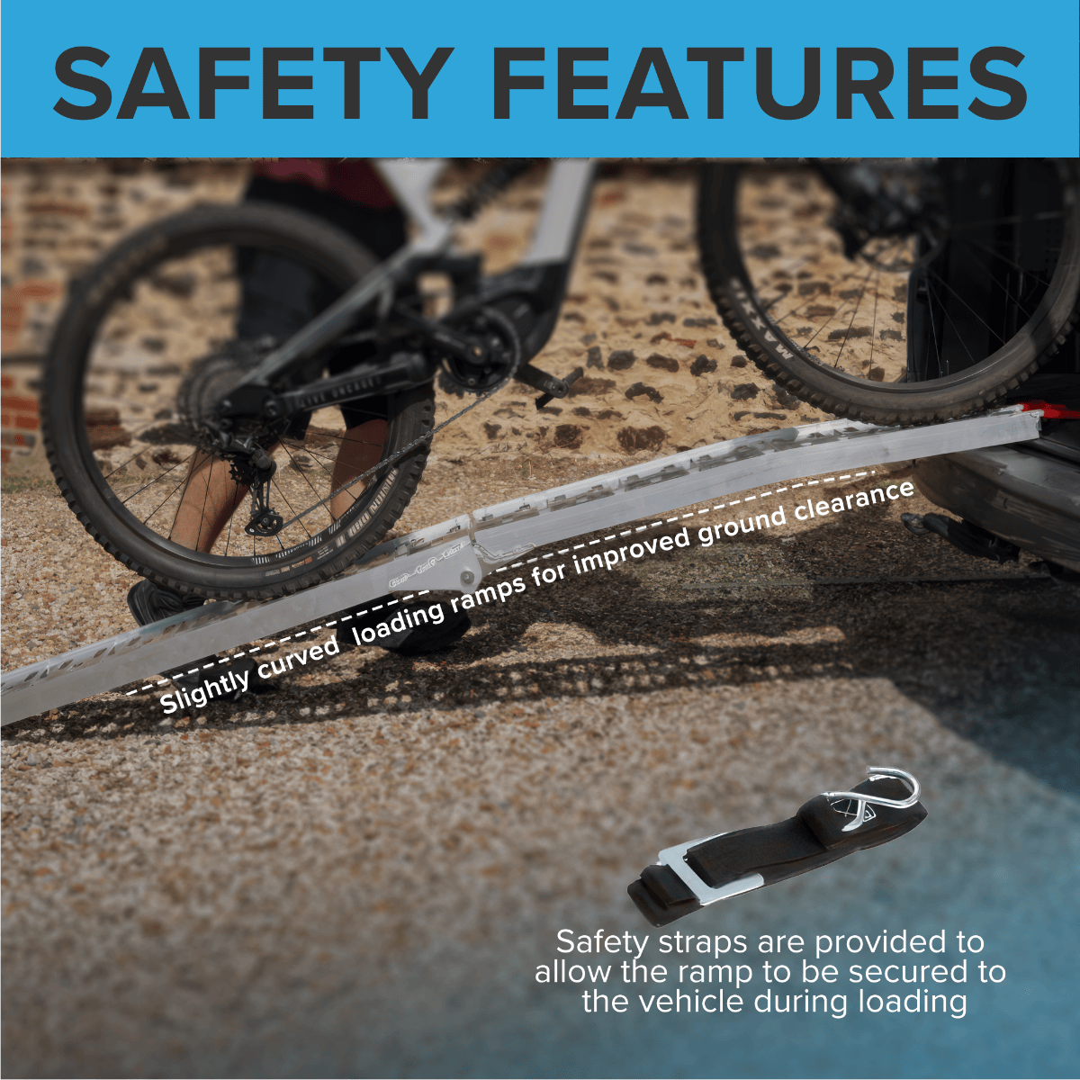 - Safety straps are provided to allow the ramp to be secured to the vehicle during loading
