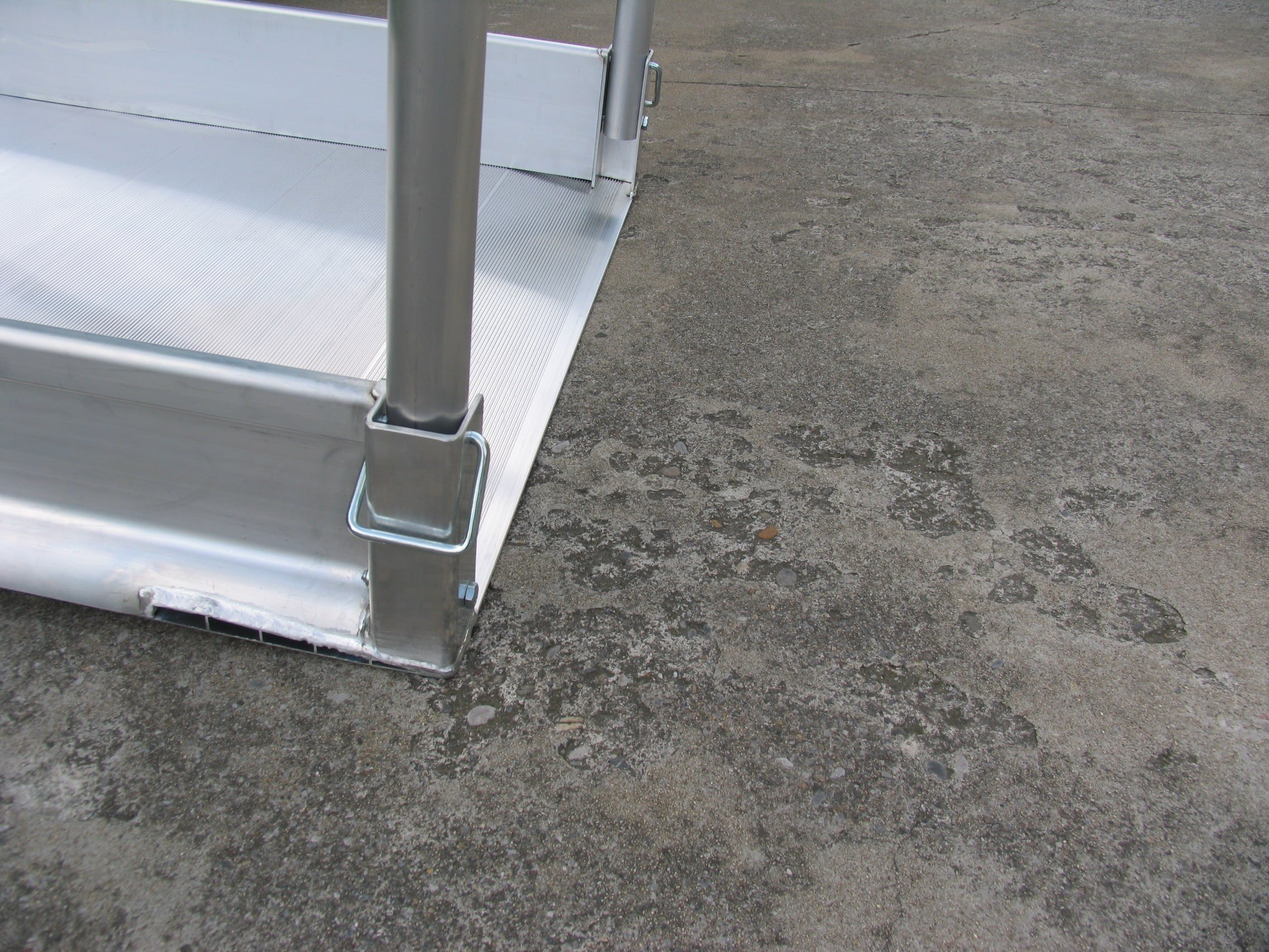 Handrail brackets on pedestrian ramp Rest on connection on pedestrian ramp Pedestrian ramp resting on kerb Pedestrian ramp 2390mm long Pedestrian ramp fully assembled