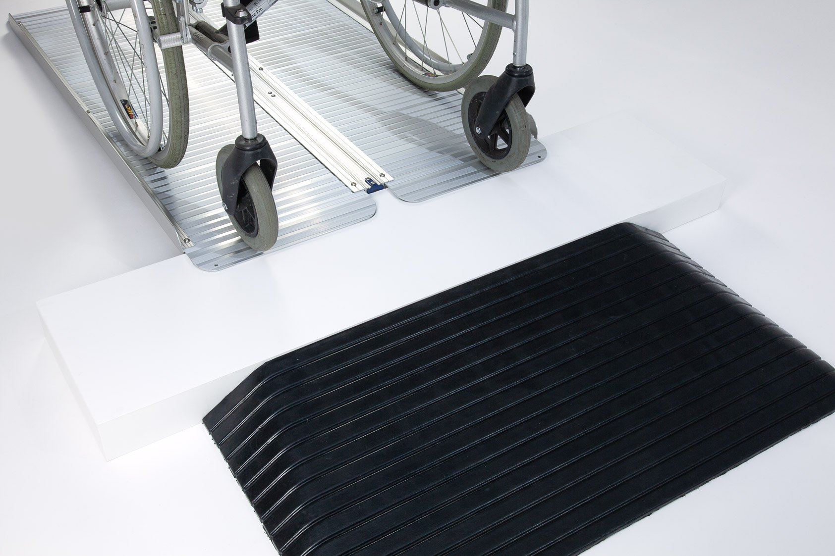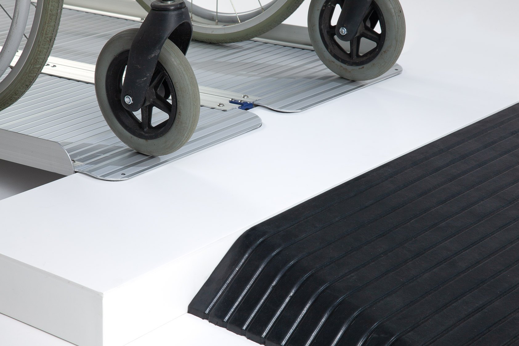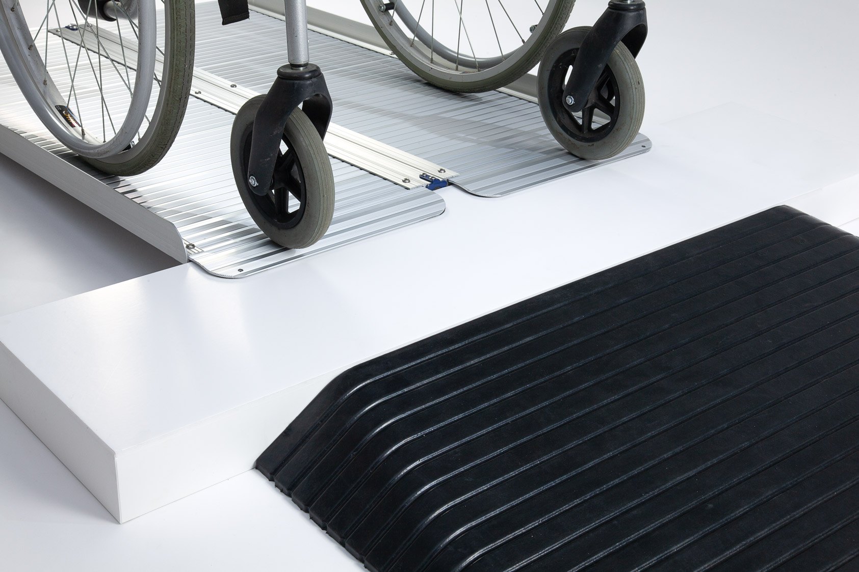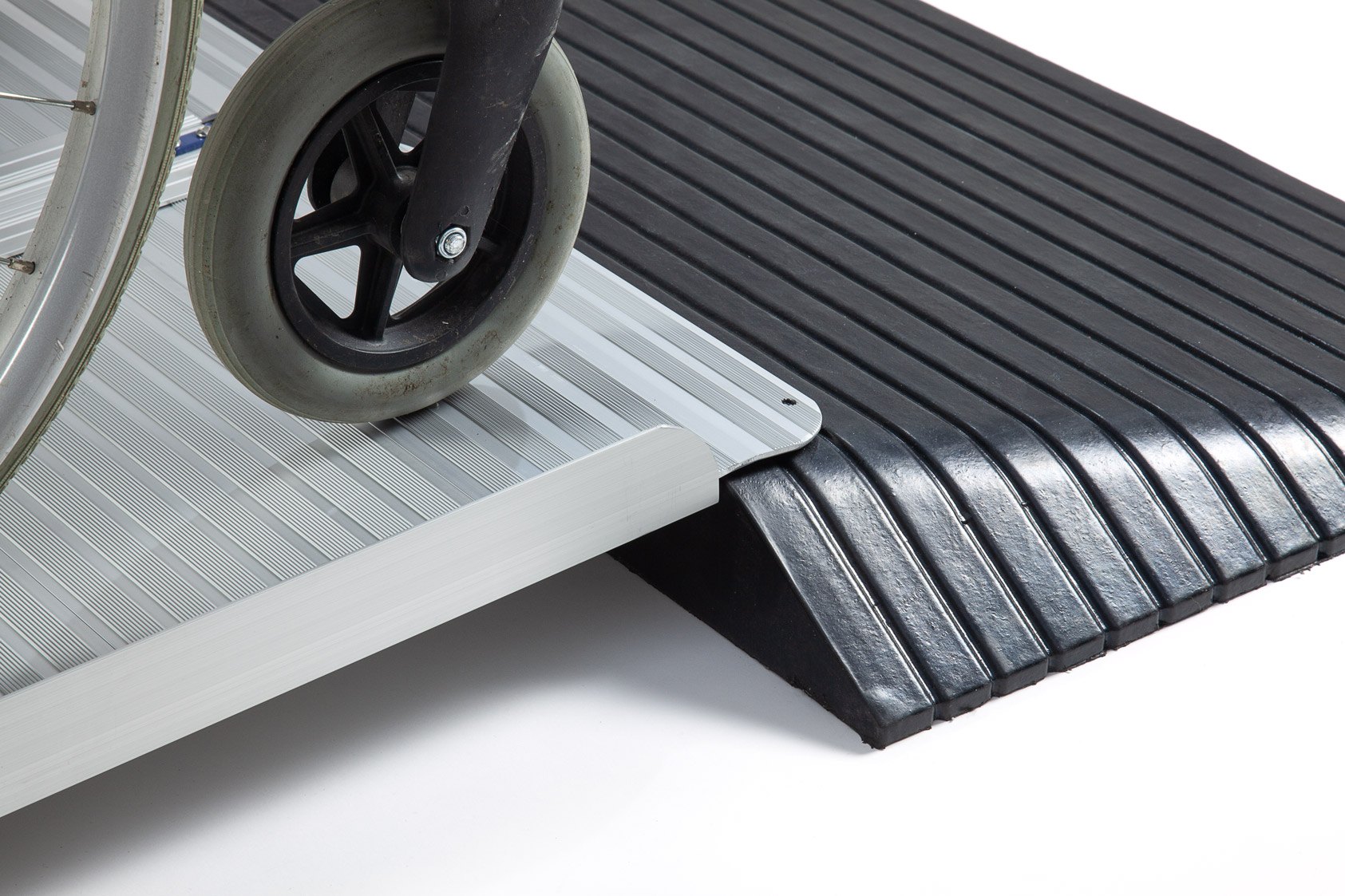The aluminium ramp works perfectly with the rubber ramp to safely bridge doorways and thresholds.