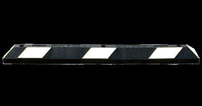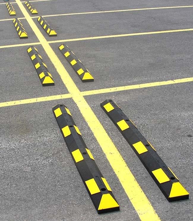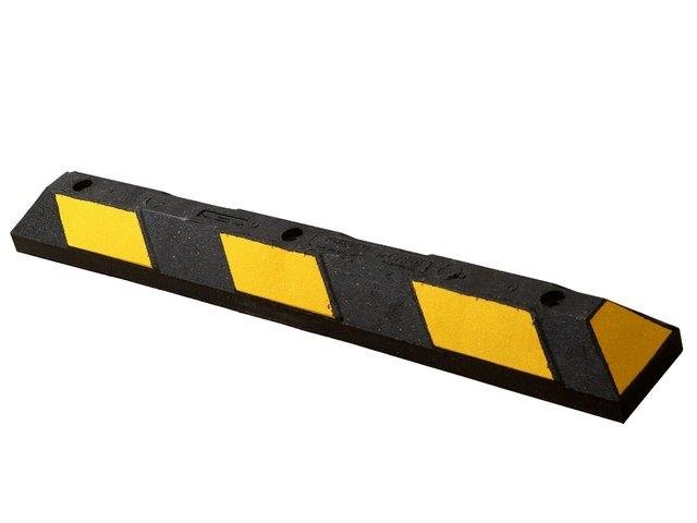 - High-density rubber wheel stop/parking block segments in contrasting black and yellow.