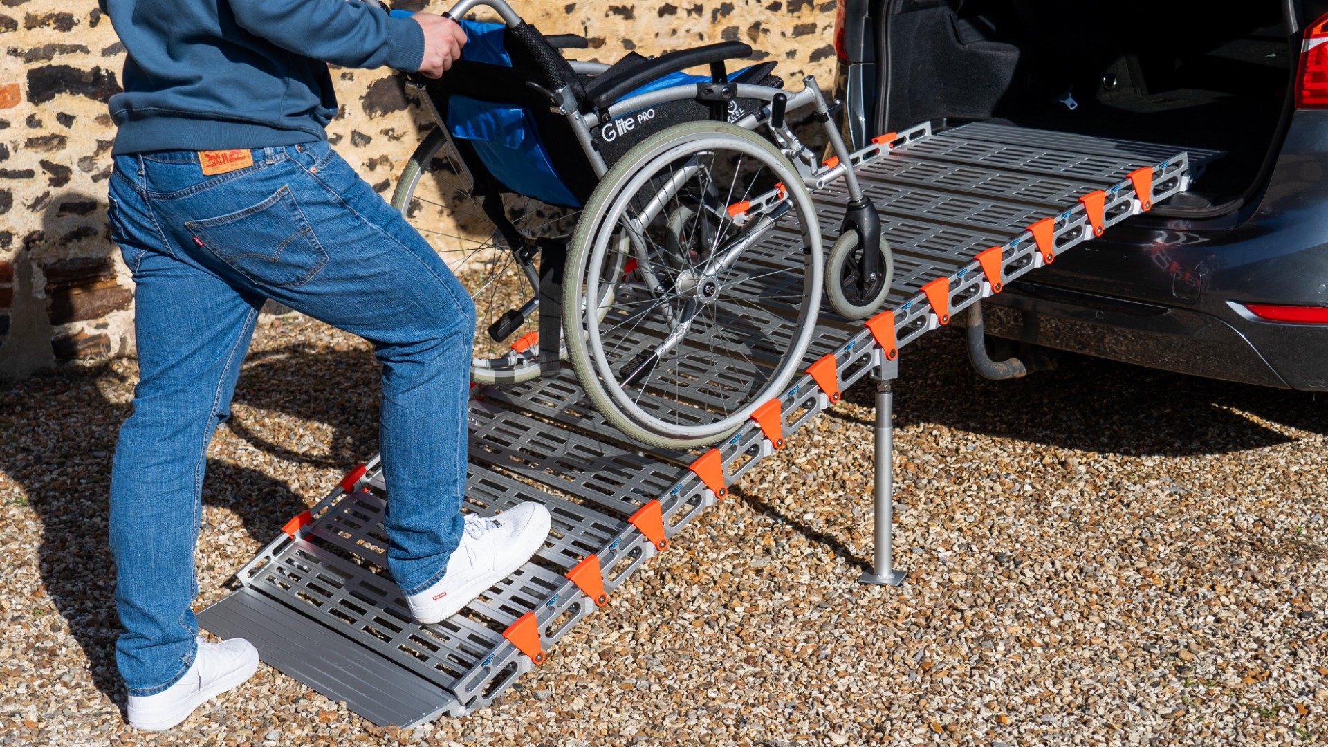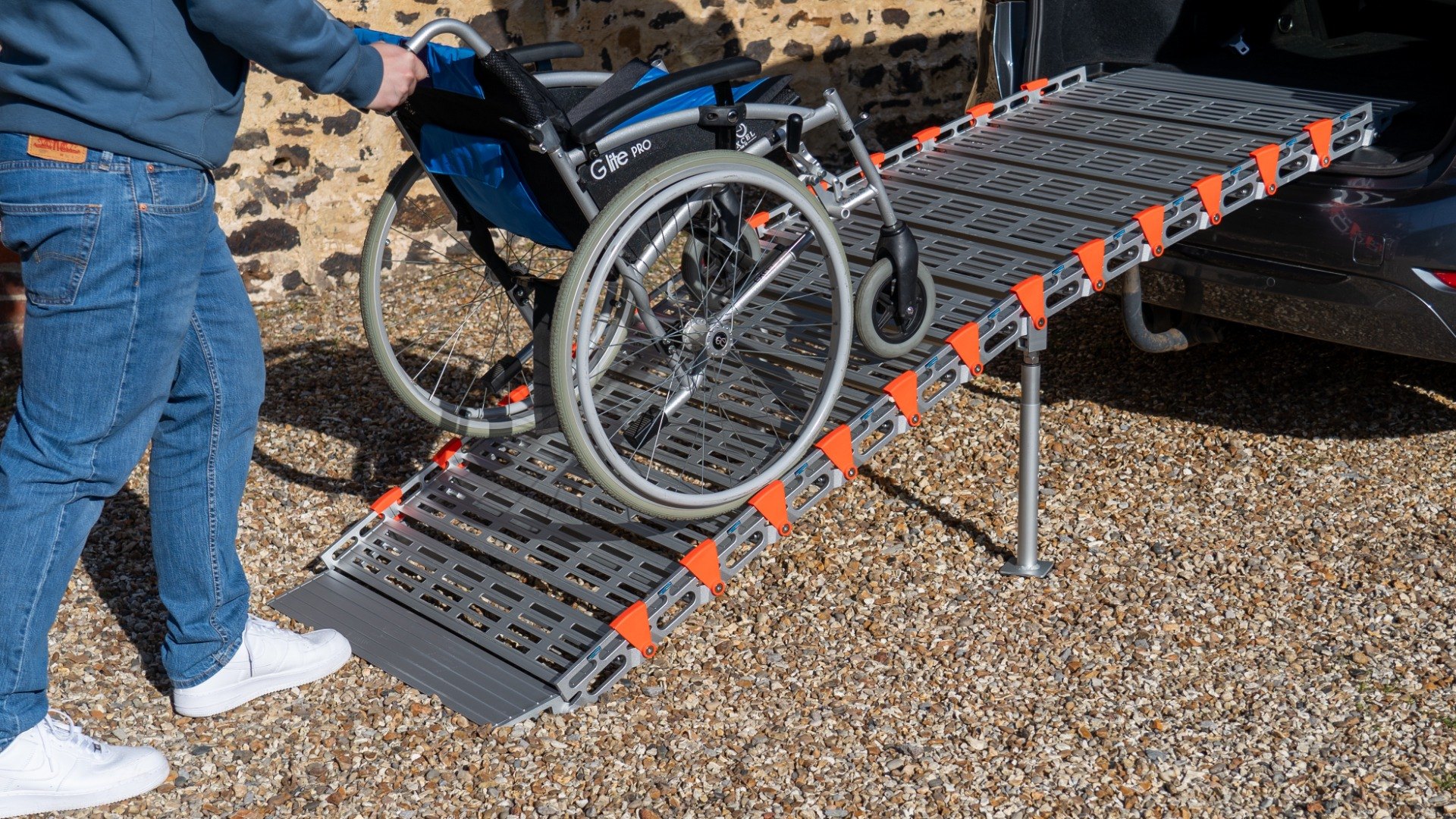 The ramp is modular and can be built to any length required. Use the Allen key to add or remove sections as needed, whether you want to shorten the ramp for lower steps, extend it to achieve a smoother gradient, or simply split it in half to make it easier to carry.