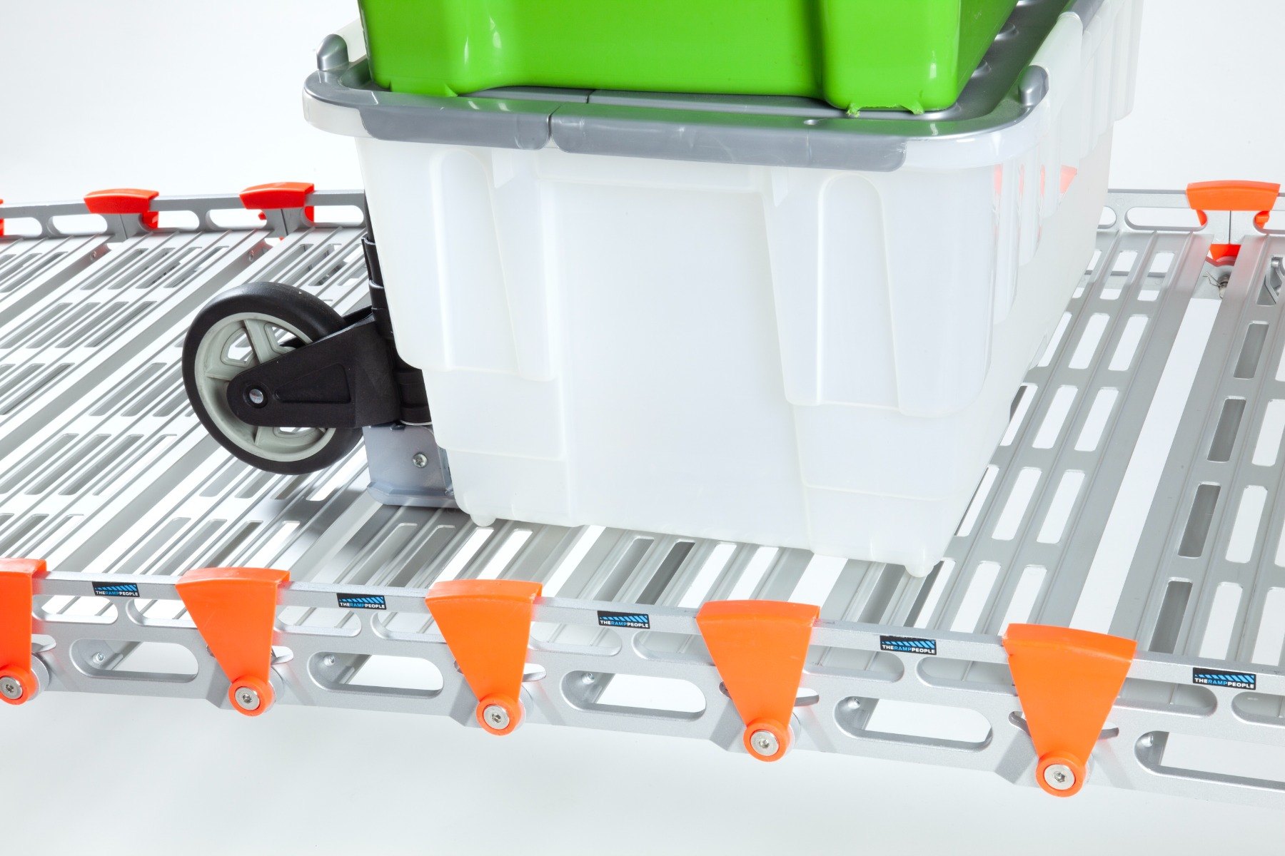 The ramp is not suitable for rubber wheels with a diameter under 20cm. It is not suitable for solid wheels, including those found on flightcases and pallet trucks.