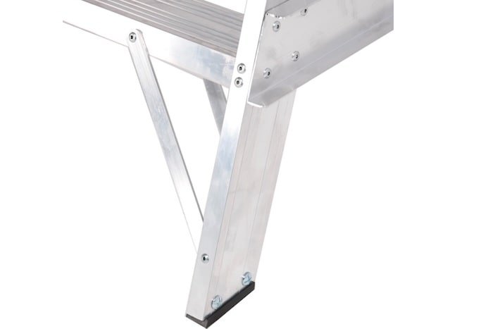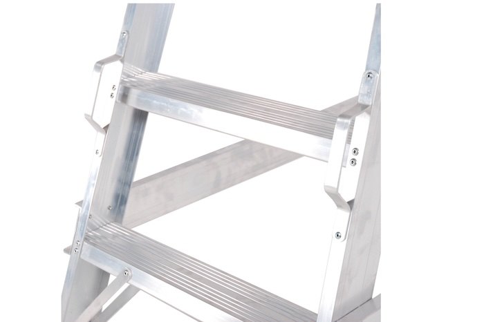 Designed to allow workers to safely work at height, the aluminium step ladder offers 80mm deep serrated treads to provide optimum traction when climbing the ladder.