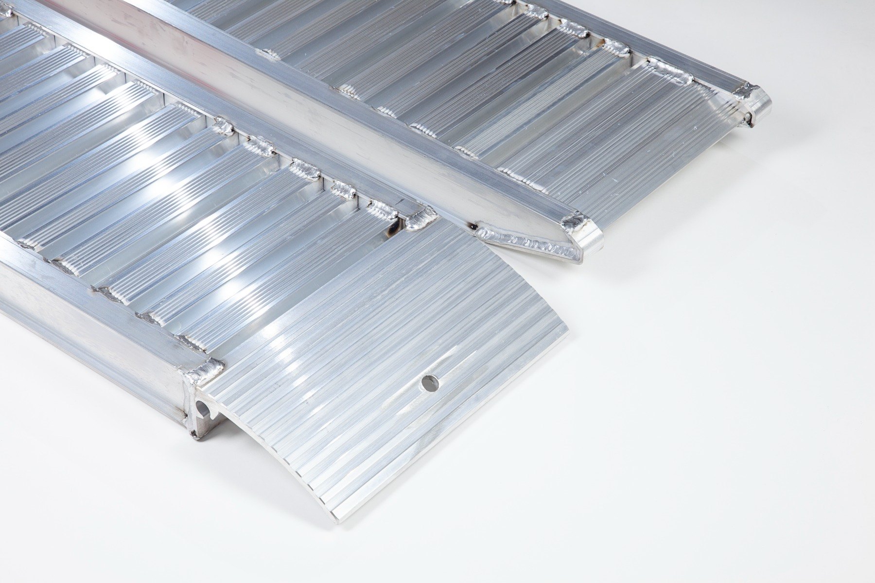 The ramps feature a curved rest-on connection with a pre-drilled hole, allowing them to be secured in place during loading using the pin and plate provided.