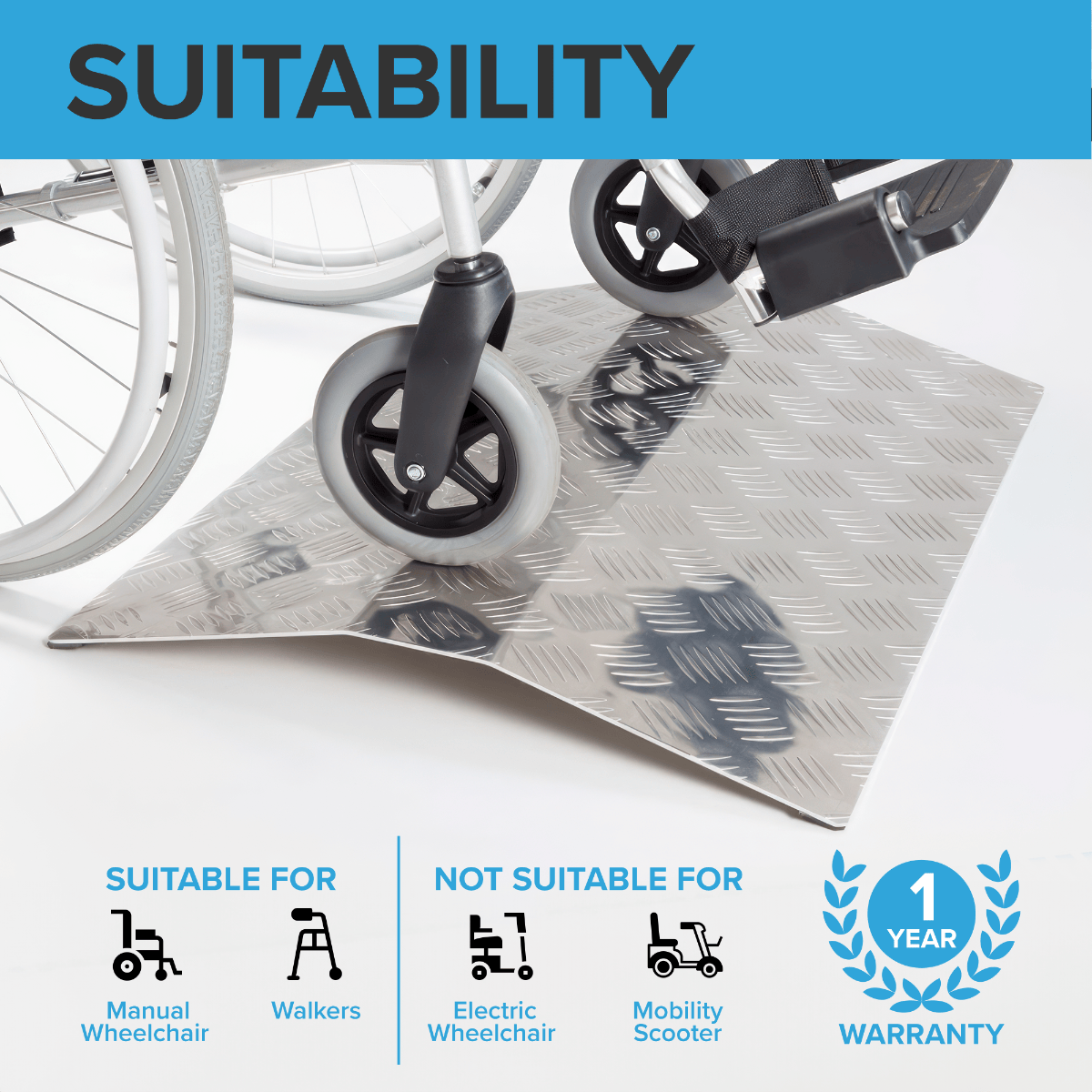 - 250kg capacity, suitable for manual wheelchairs and walkers, not suitable for electric wheelchairs or mobility scooters