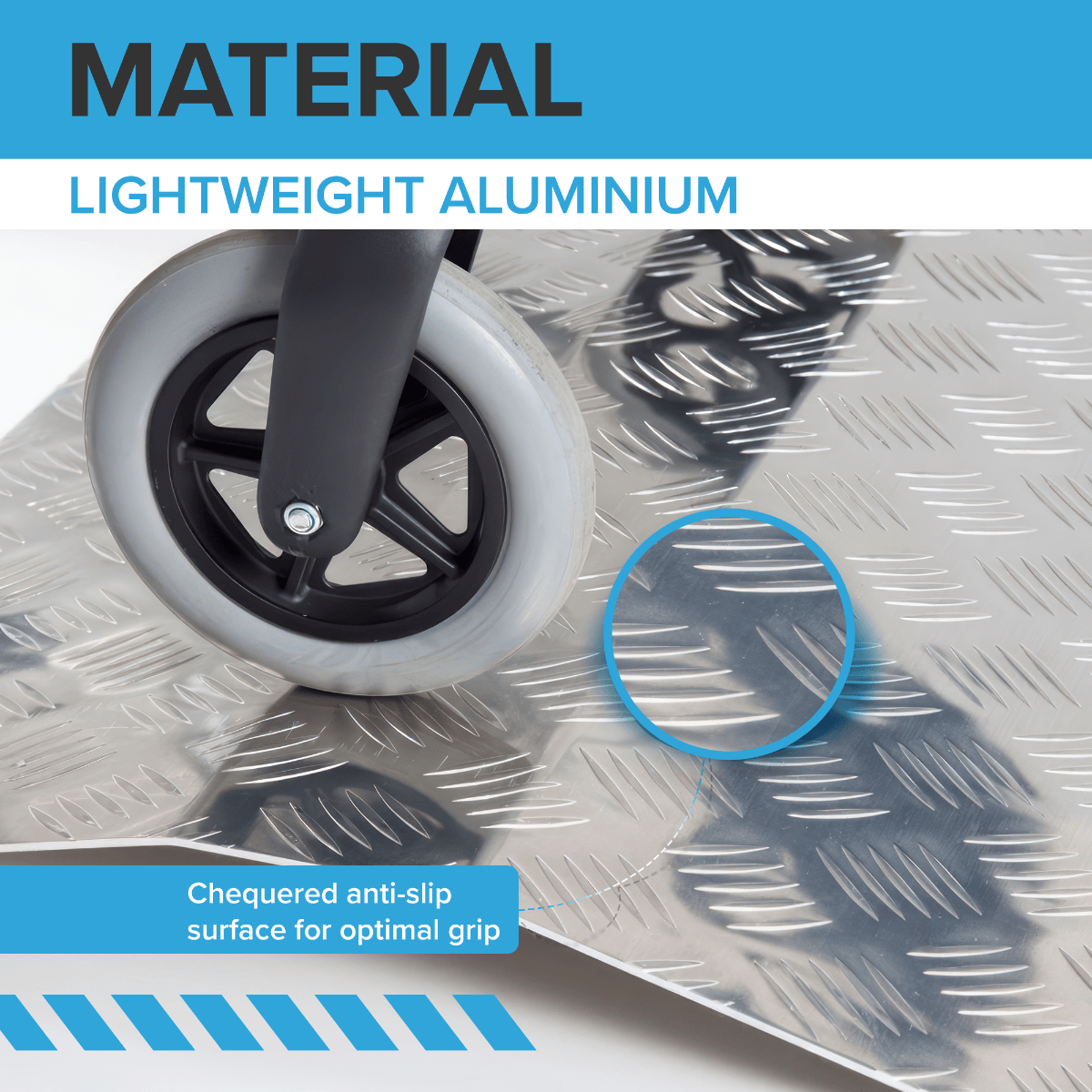 Manufactured from aluminium, the bridge ramp is lightweight, weighing just 3 kg to 6.2 kg depending on the chosen height. It’s easy to lift and reposition when needed.